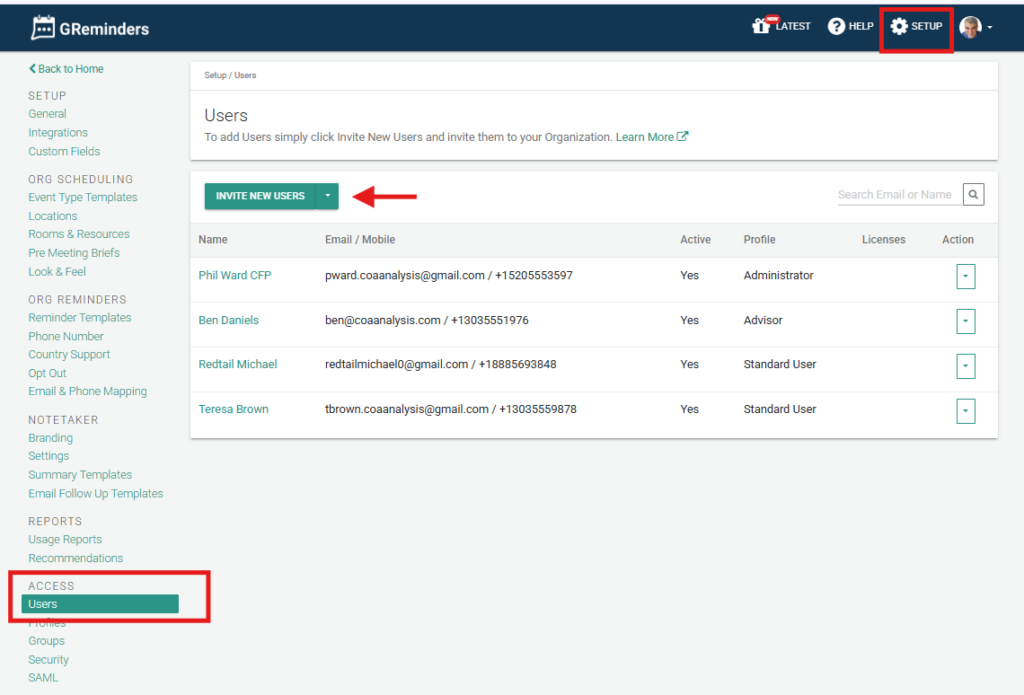 Below you will see a general outline of the GReminders Organizational Hierarchy. Almost everything you see in the SETUP section will affect the entire Organization. The two concepts to understand are: