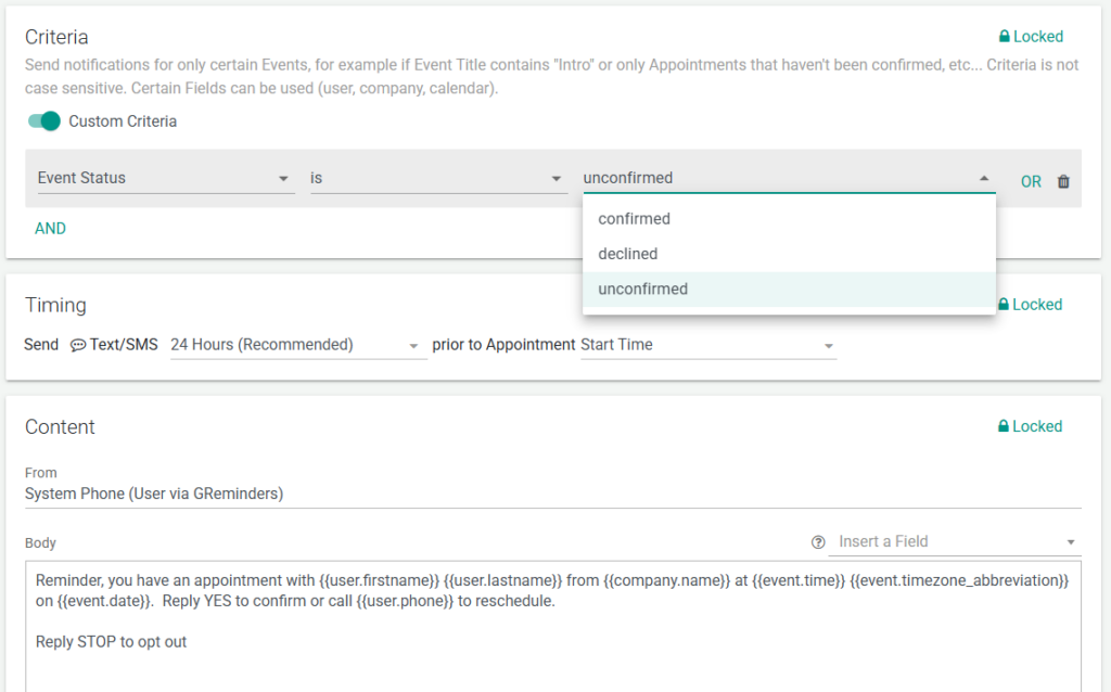 GReminders’ advanced criteria feature set to “Event Status is unconfirmed” will trigger a reminder like, “Please Reply YES to Confirm…” Only clients who have failed to confirm their appointment will receive this reminder.