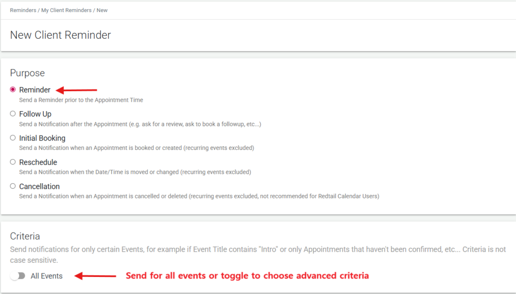 This is a reminder template. You can send the reminder to all events or change the criteria to only send when something in the event, the name, the calendar, the time, etc., matches the criteria. Reminder criteria only looks for meeting criteria on your calendar, not contact criteria. We’ll leave it at “All”. Next, choose whether to send an SMS, email, or voice call reminder. You can also choose when to send it.