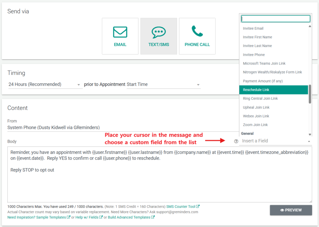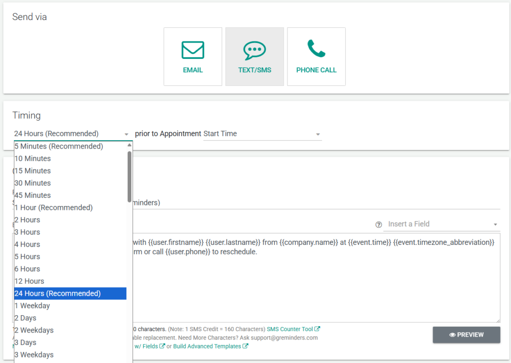 We give you lots of options of when you can choose to send a reminder. In this example we’ll select 24 hours prior to the appointment. Next you can edit the message however you like or use one of the templates linked below. Just remember that custom fields, surrounded by double brackets, will pull directly from the information in the appointment.