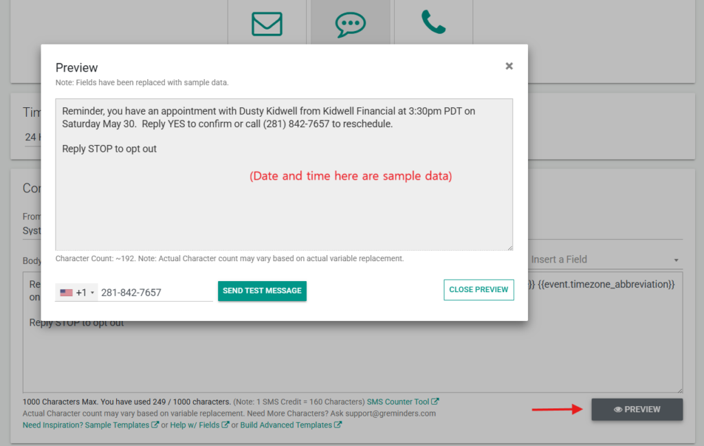 When you click “Preview”, some of the variables are filled with sample data. You can have as many templates as you like. Create a nickname for your templates, it’ll help you keep organized.