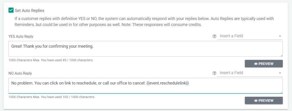 Edit the response that is sent when the SMS reminder is replied to with YES or NO based on your cancellation and reschedule process.