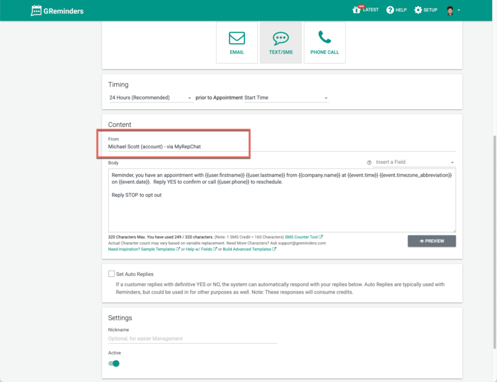 GReminders also allows you to send Text/SMS messages via your MyRepChat phone number. Click HERE to read more on how to send SMS messages from your MyRepChat number.