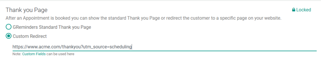 In this example they would be redirected to https://www.acme.com/thankyou?utm_source=scheduling and we even pass in a utm code (which is a common code for tracking marketing campaigns).