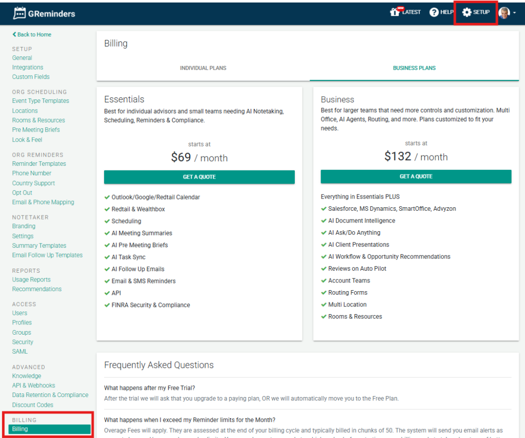 Select the right plan and packages for your needs under Billing. You can also cancel and delete your account here.