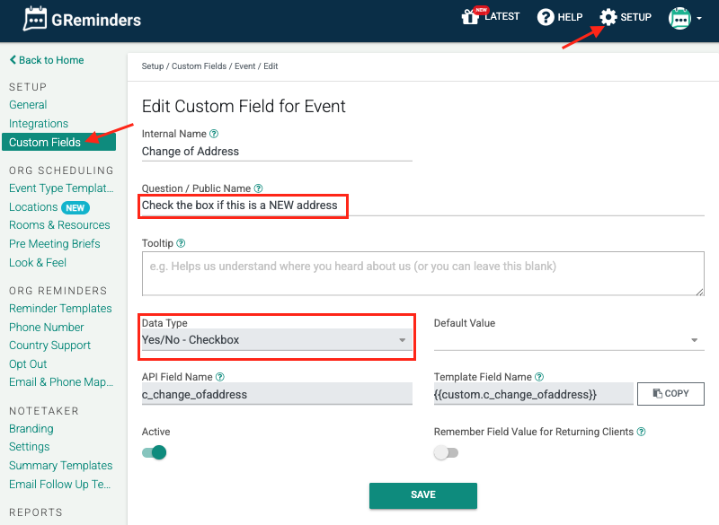 1. Go to ‘Setup‘ > ‘Custom Fields‘ to create your questions. (example above)