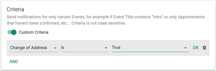 2. Add Custom Criteria such as: ‘Change of address‘ > ‘is‘ > ‘True‘.