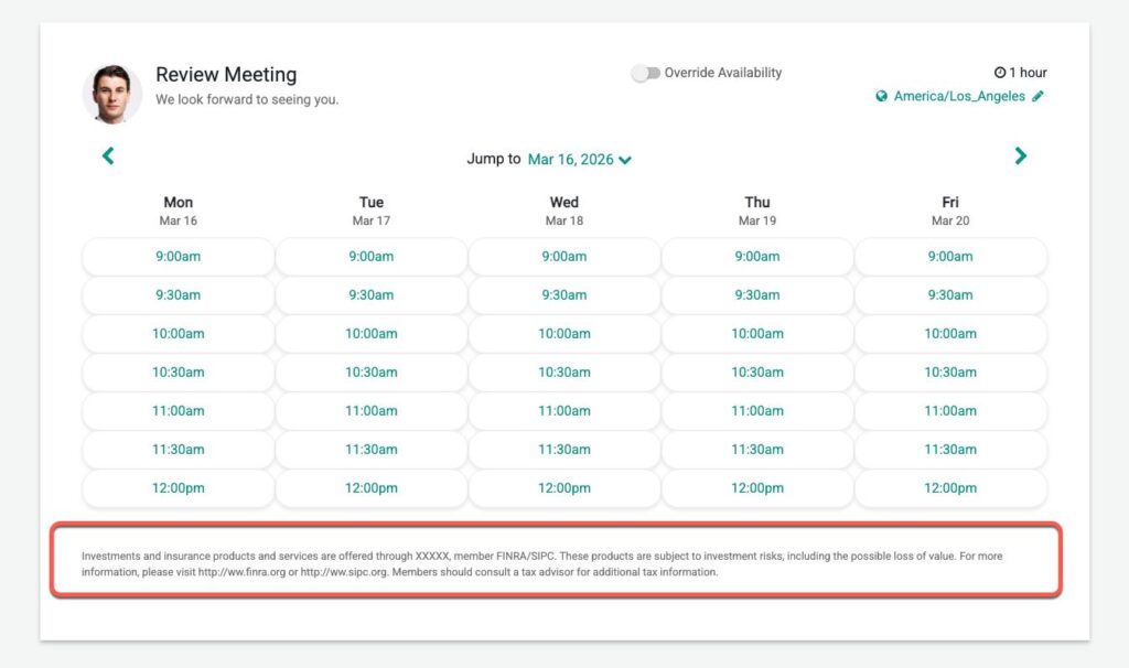Public booking pages for financial advisors often require disclosure language to meet regulatory and compliance requirements. Because a scheduling page can be considered a form of marketing or client communication, regulators such as the U.S. Securities and Exchange Commission and Financial Industry Regulatory Authority may require advisors to clearly identify their firm, include appropriate disclaimers, and avoid misleading statements. Disclosures help ensure transparency for prospects by clarifying the advisor’s affiliations, the nature of the meeting, and any limitations on the information being provided, while also helping firms stay aligned with internal compliance policies.