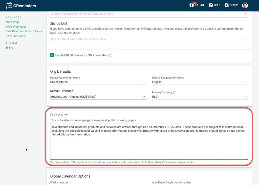 GReminders ships with a Disclosure field out of the box. Simply go to Setup > General and enter your typical Disclosure language