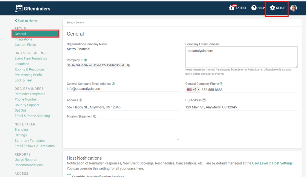 Under Setup are general settings, which allow administrators on the account to control settings for the entire organization.