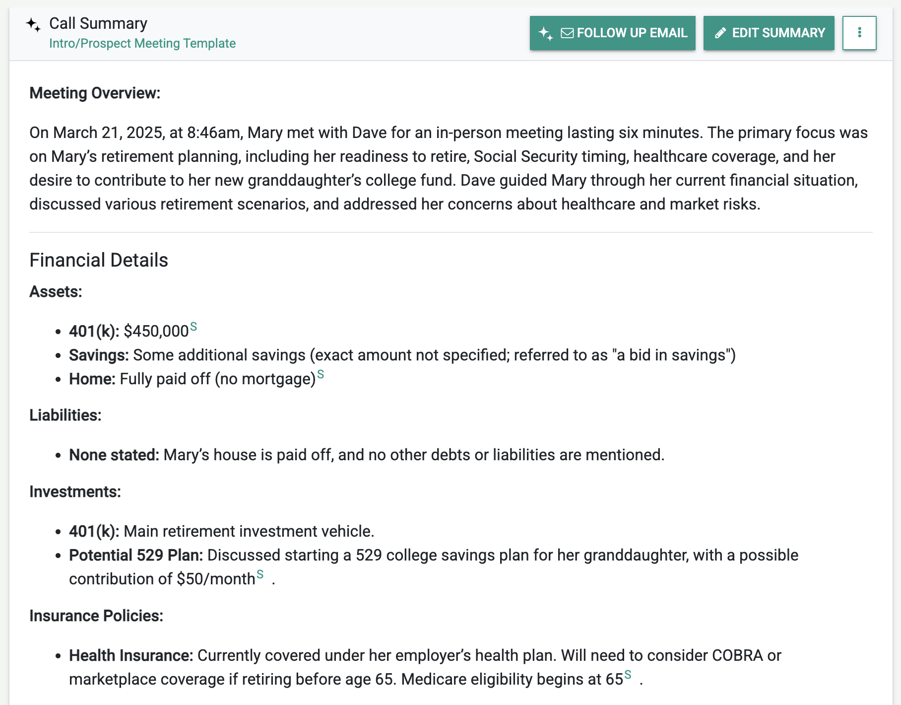 When you’re ready, navigate to an existing meeting to see your template in action. If you didn’t assign this template type to a meeting type but would like to see if it pulls the right information for you, you can apply your new template in the “Call Summary” section of your meeting captured in Notetaker by clicking the three vertical dots and selecting “Regenerate Summary”. Otherwise, you’ll see your template already applied for a meeting captured with the template assigned to the type.