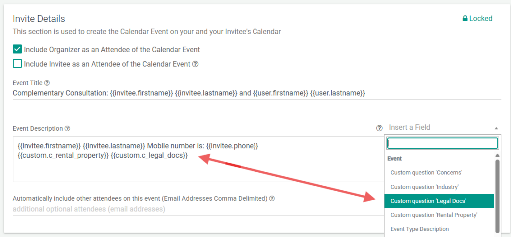 In order to pass these custom fields on to 3rd party forms, like Google Forms, you will need to create a link. To make things easy while building the link, use the Event Description box (located just below the fields drop-down list). Begin by removing any text in the box that is not surrounded by curly brackets, {{your fields}}.