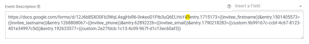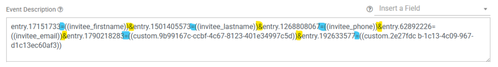 Copy only the IDs you’ll be matching with your custom fields and paste them one at a time, into the Event Description box in GReminders, directly in front of the field they represent. Add an equals sign after the field ID and include an ampersand between each statement so it looks similar to this: entry.xxxx={{invitee.firstname}}&(entry.xxxx={{invitee.lastname}} Make sure there are no spaces.
