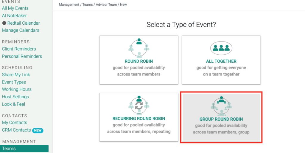 In certain scenarios—such as scheduling classes or webinars—you may require a Group Round Robin Event to accommodate pooled availability across multiple GReminders users. These event types are created within Teams in your GReminders account. Each Team represents a group of individuals who are eligible to host or organize the upcoming class or webinar.