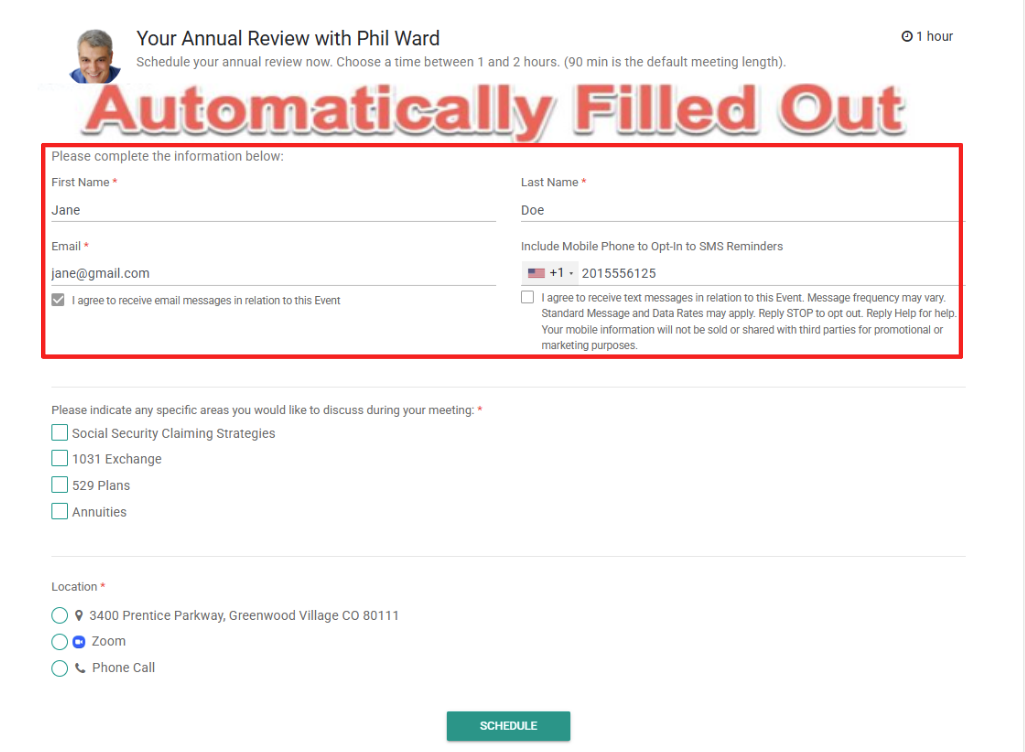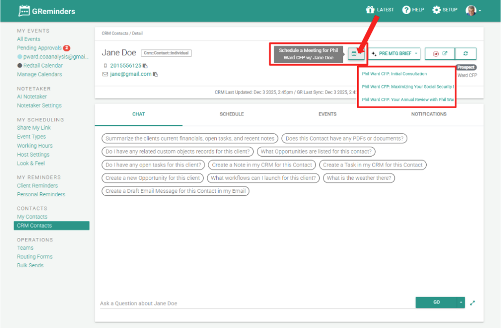 If you are syncing your CRM Contacts back to GReminders, you can automatically book a meeting on behalf of your clients very easily with all the data automatically pre-populated for you.