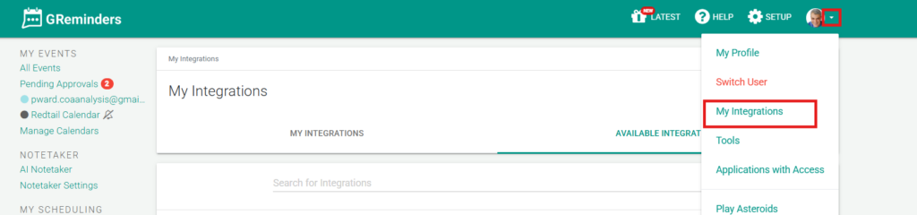Now your Users can connect their Mailboxes. They can do this by going to the drop down arrow next to their photo or initials, selecting My Integrations, clicking on the arrow next to Google Mail, and granting permissions to their Mailbox.