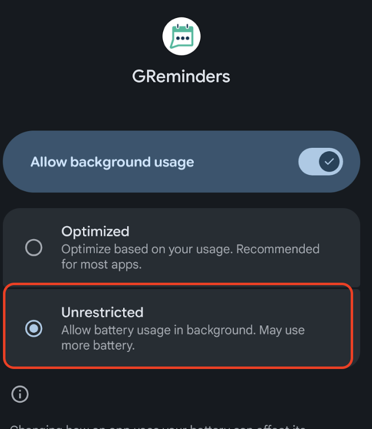 Now click on “Unrestricted” which will allow the GReminders mobile app to be officially whitelisted regarding battery optimization.