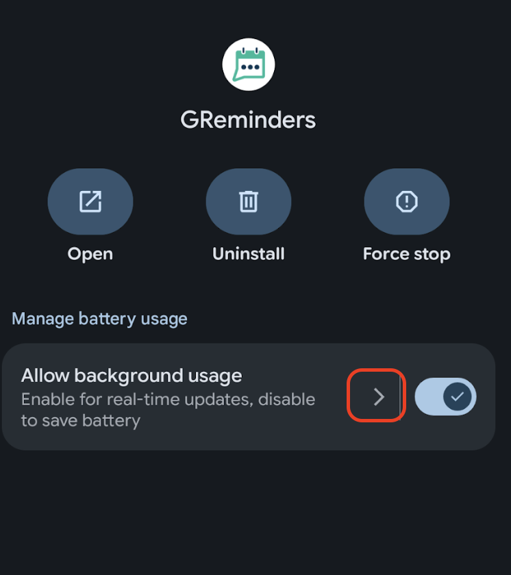 To enable battery optimization whitelist, click on “Battery optimization Whitelist” in the GReminders app and press the arrow button to the right of “Allow Background Usage.”