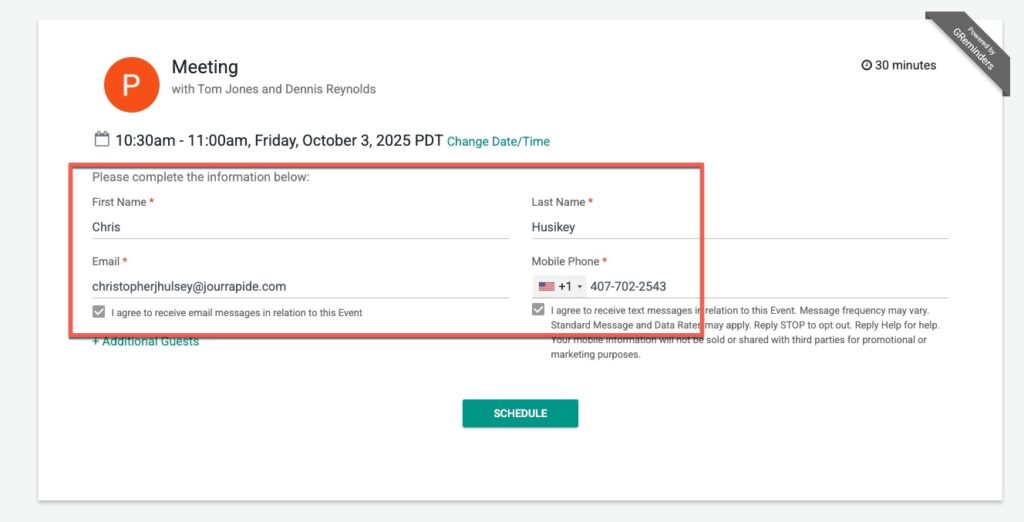 You will see the Customer Data is automatically filled in to make easier for the client AND easier for you if you are booking a meeting on their behalf.