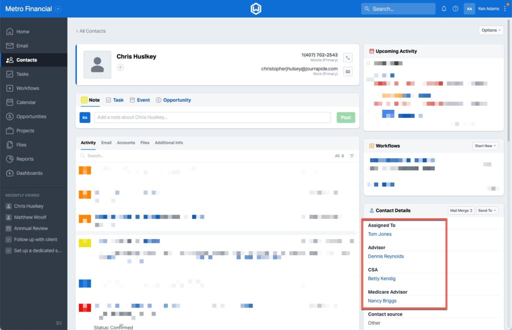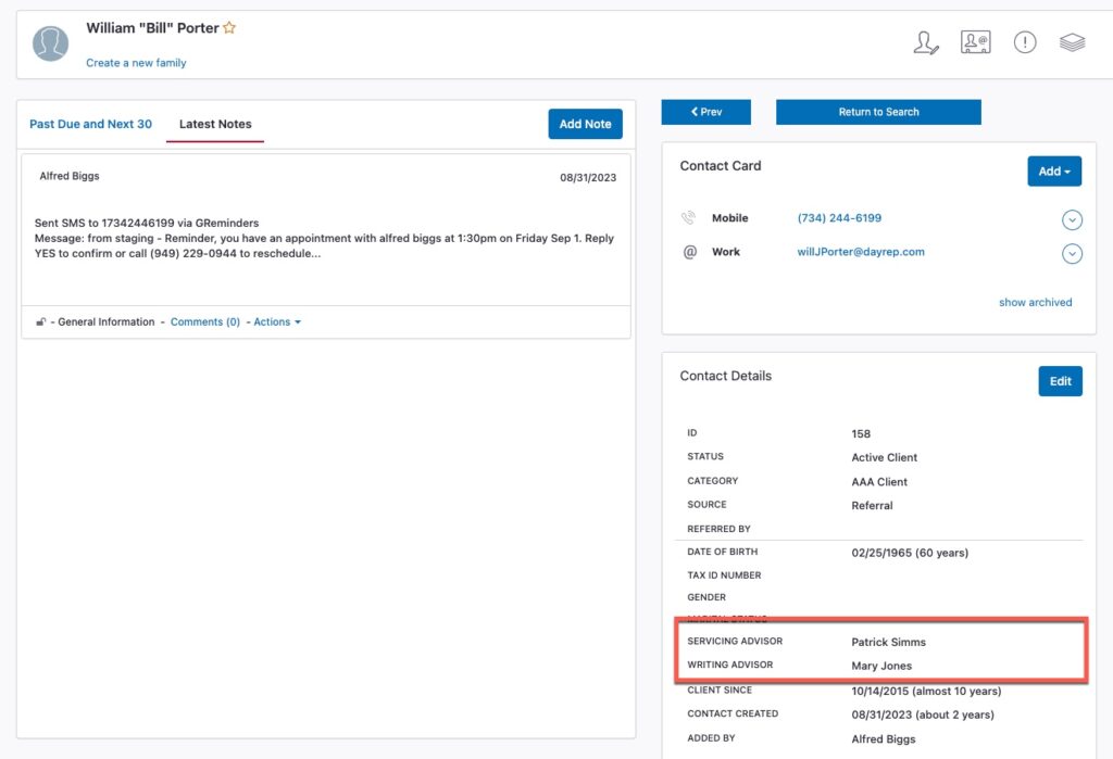 First you need a compatible CRM which includes Redtail, Wealthbox, Salesforce / Financial Services Cloud (and any of the Overlays such as Practifi, Quivr, XLR8, Elements, etc…), Dynamics, etc… Your Contact record probably looks something like this: