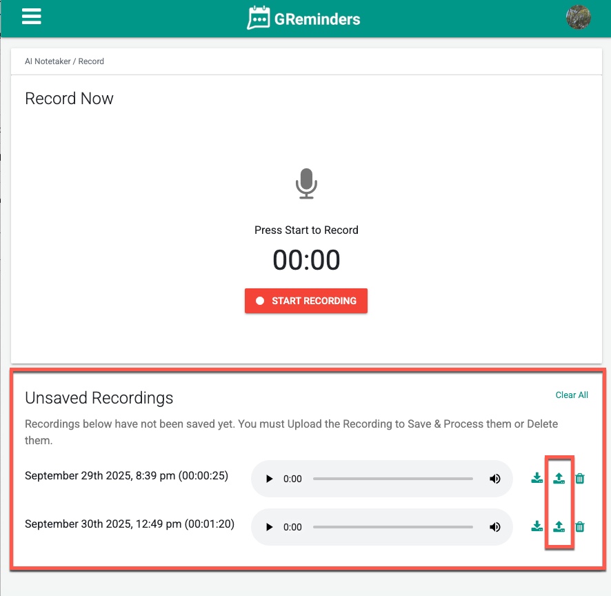 If you do not see this Unsaved Section this means the recording was uploaded successfully. If you do not see your Meeting Summary under AI Notetaker within the Application please contact [email protected].
