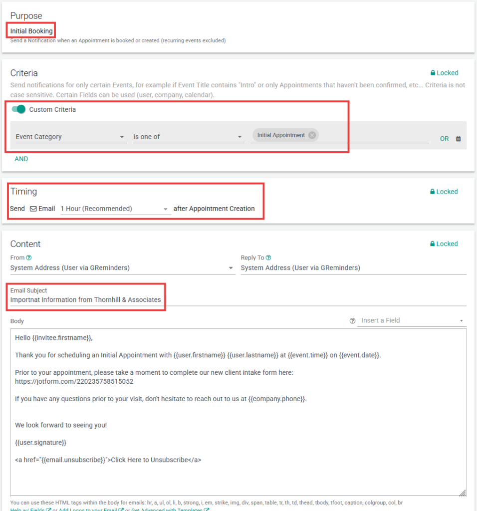 - Choose the Reminder Purpose (in this example, an Initial Booking Notification)