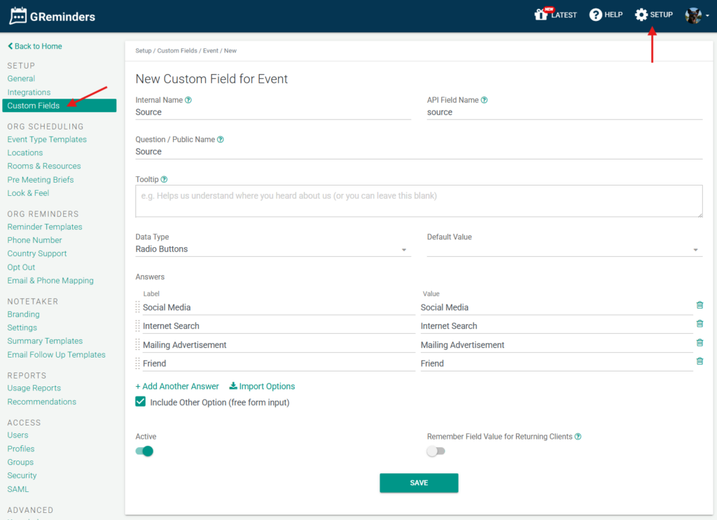 Step 1. Create “Source” as a custom field in GReminders. Under Setup, select Custom Fields, then click Create New.