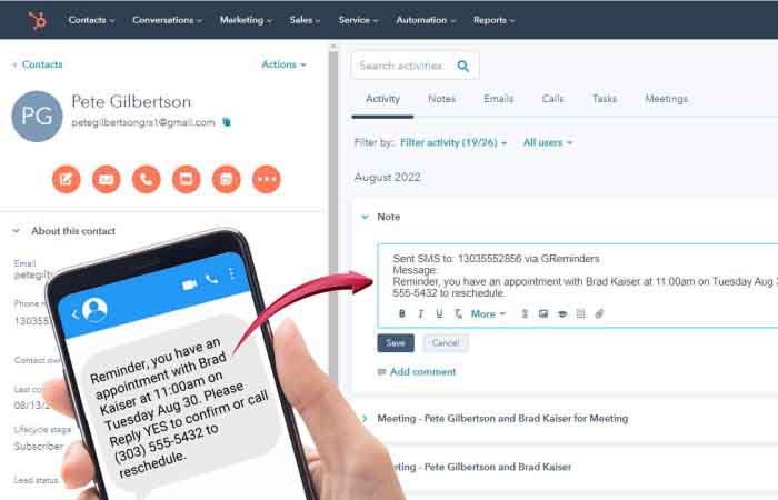 Schedule meetings with HubSpot contacts and automatically send SMS reminders using GReminders. Your prospects and clients will remember their appointments and you’ll reduce your no-shows dramatically. Once you set up GReminders and integrate with HubSpot, the application works in the background; schedule a meeting and reminders are sent automatically.